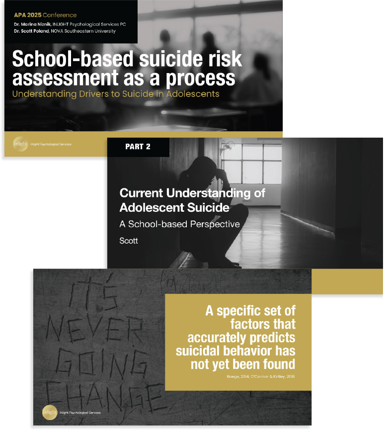 This session focuses on suicide assessment as a process. Evidence-based measures are presented within a broader contextual framework to improve identification of drivers of suicide in adolescents.